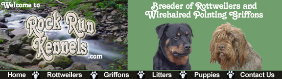 Welcome to Rock Run Kennels, home of Rock Run Rottweilers and Wirehaired Pointing Griffons.  The kennel name, Rock Run, is named after the stream that flows in front of our twelve acres where the dogs have plenty of room to run and swim.